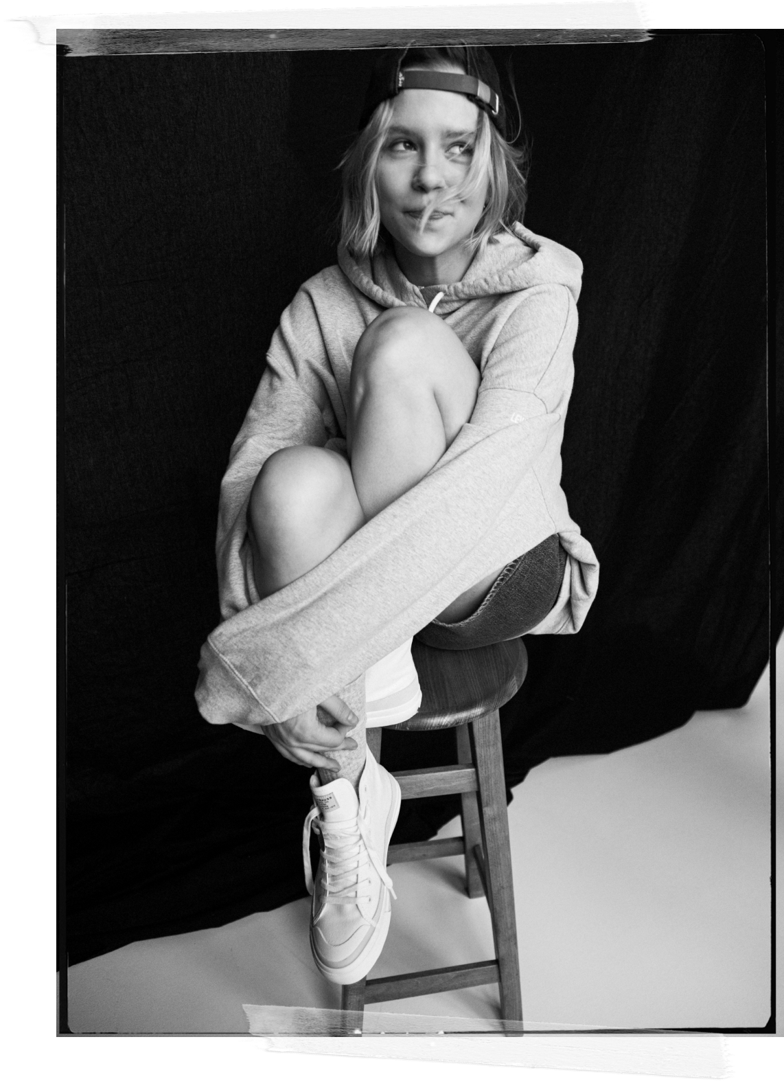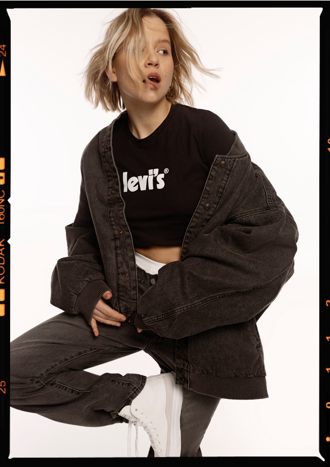 На Катерині: чорна футболка, чорна джинсова куртка, білі хайтопи, сіре худі, джинси Levi’s® 501®