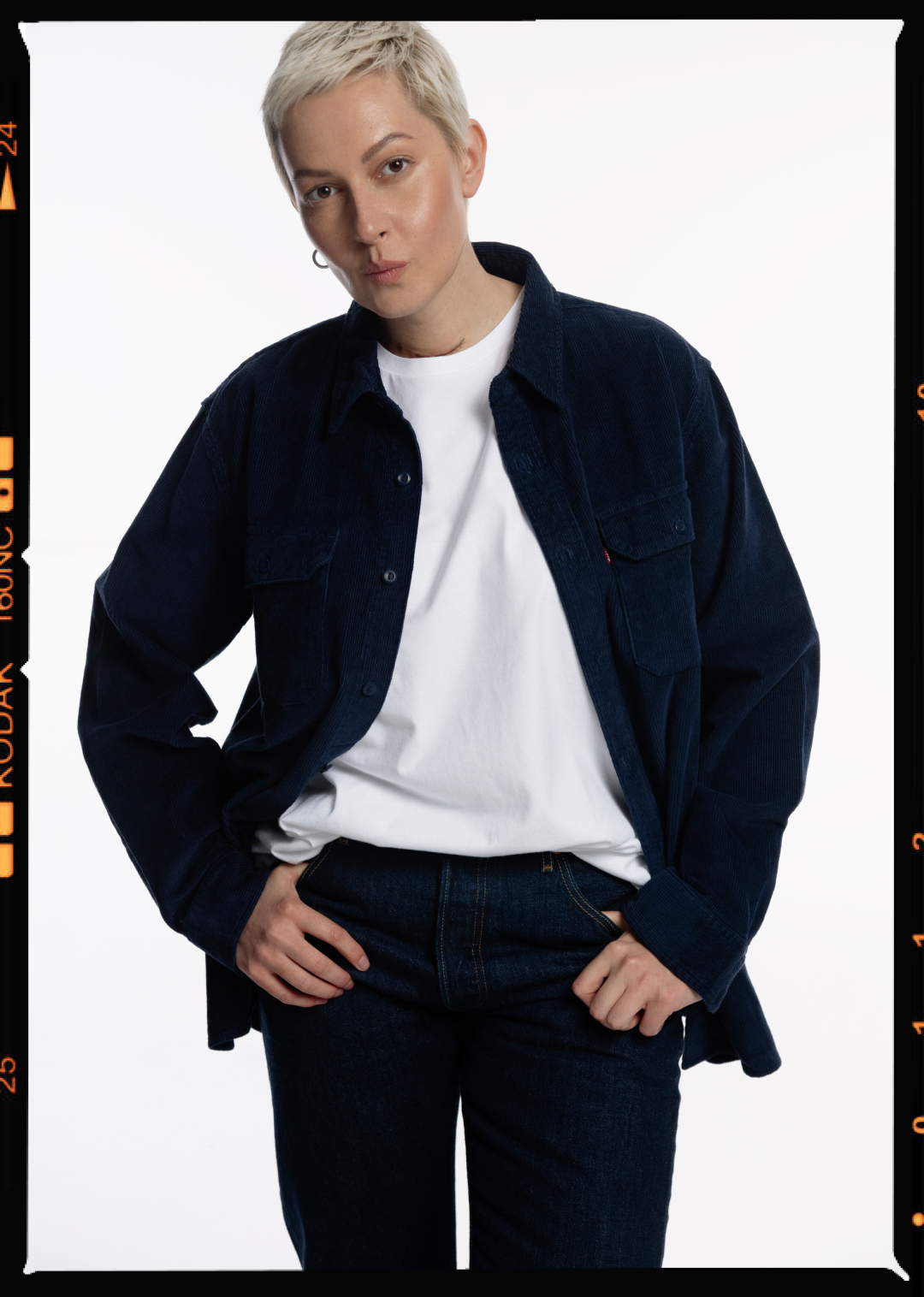 На Ярославі: білий світшот, темно-синя вельветова сорочка, біла футболка, темно-сині джинси Levi’s® 501®
